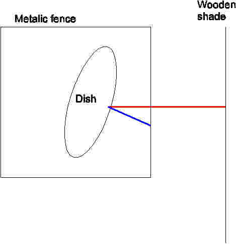 The red line shows how the elevation of the wooden shade has been measured, considering that the azimuth was full East. If the real azimuth had been used, the horizontal distance between the base of the dish and the shade would have increased, so the elevation would have dimisished. This leads me to say that the wooden shade is not interfeering with the uplink signal.